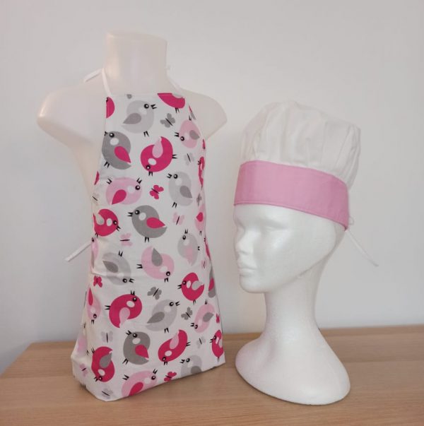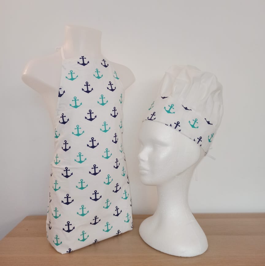 La toque est réglable. Elle et composée de tissu coton assorti au mieux au tablier. Elle se règle grâce à deux petits liens situés à l’arrière de la toque.